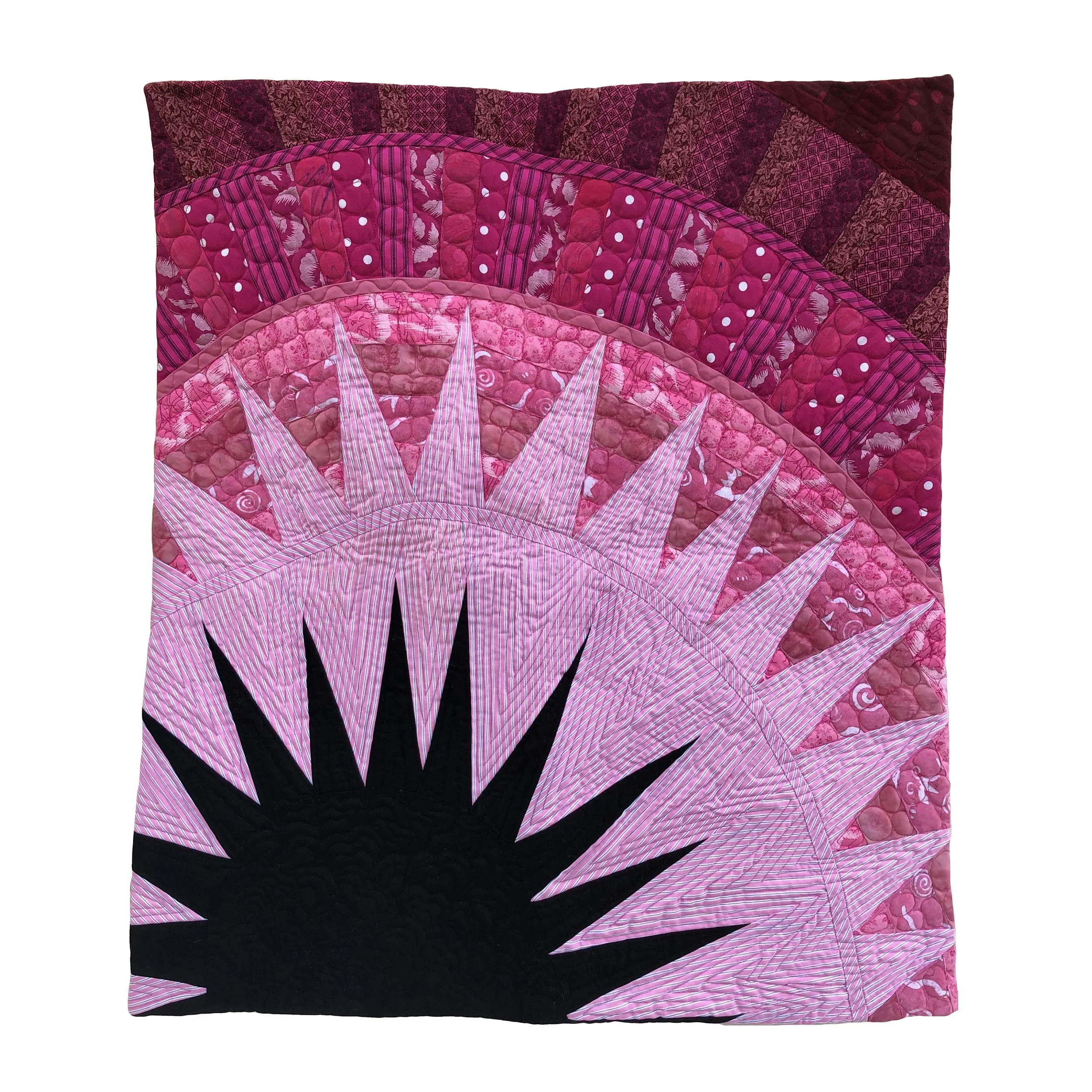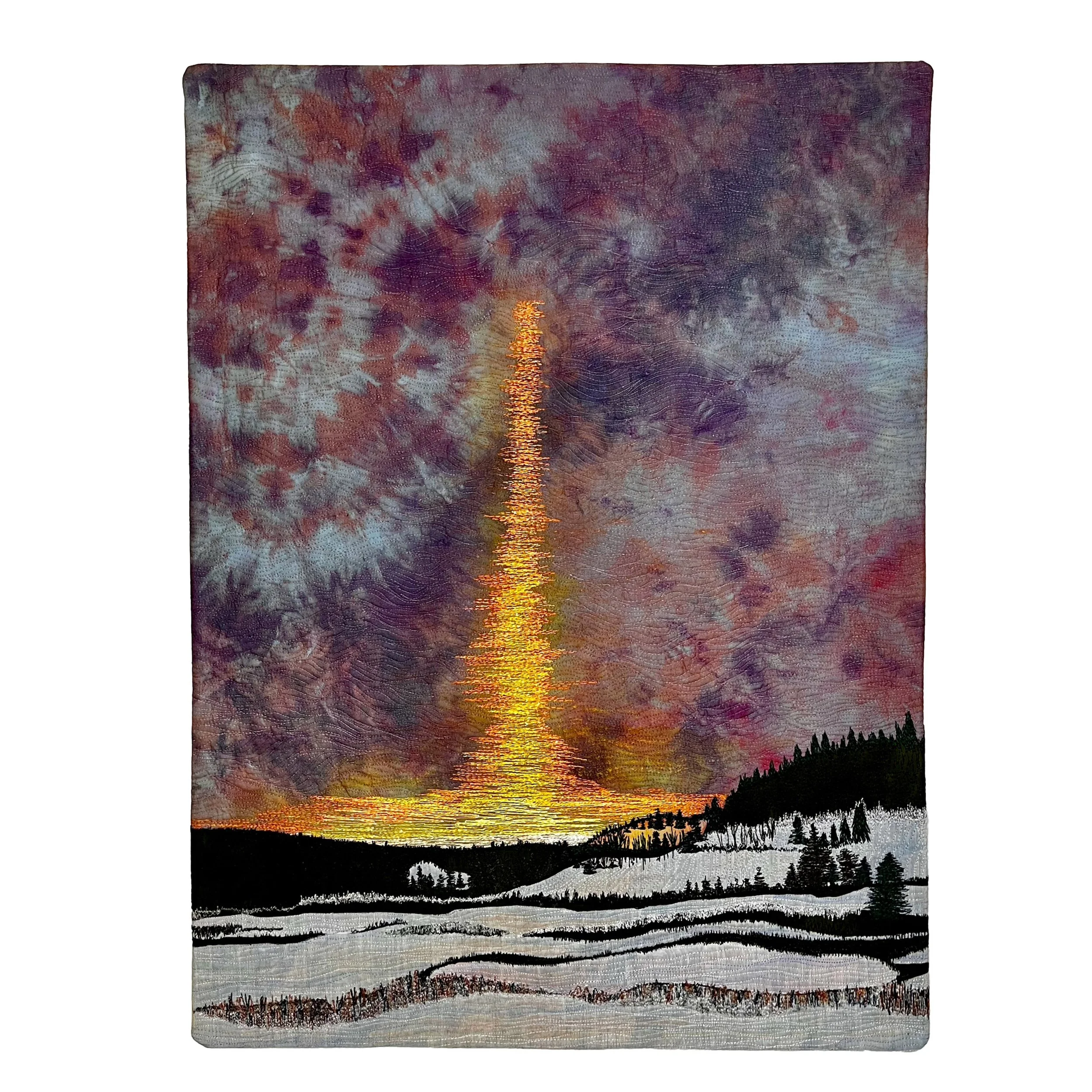 Inspired by a photo by the artist, a sun pillar is depicted, as seen on a lake in British Columbia on a cold winter evening. The fleeting phenomenon occurs when sunlight reflects off ice crystals in the frigid air, creating a vertical beam of light that cuts through the stillness. This quilt celebrates nature’s transient wonders and the peace found in the wild. Dimensions: 24" x 18"
