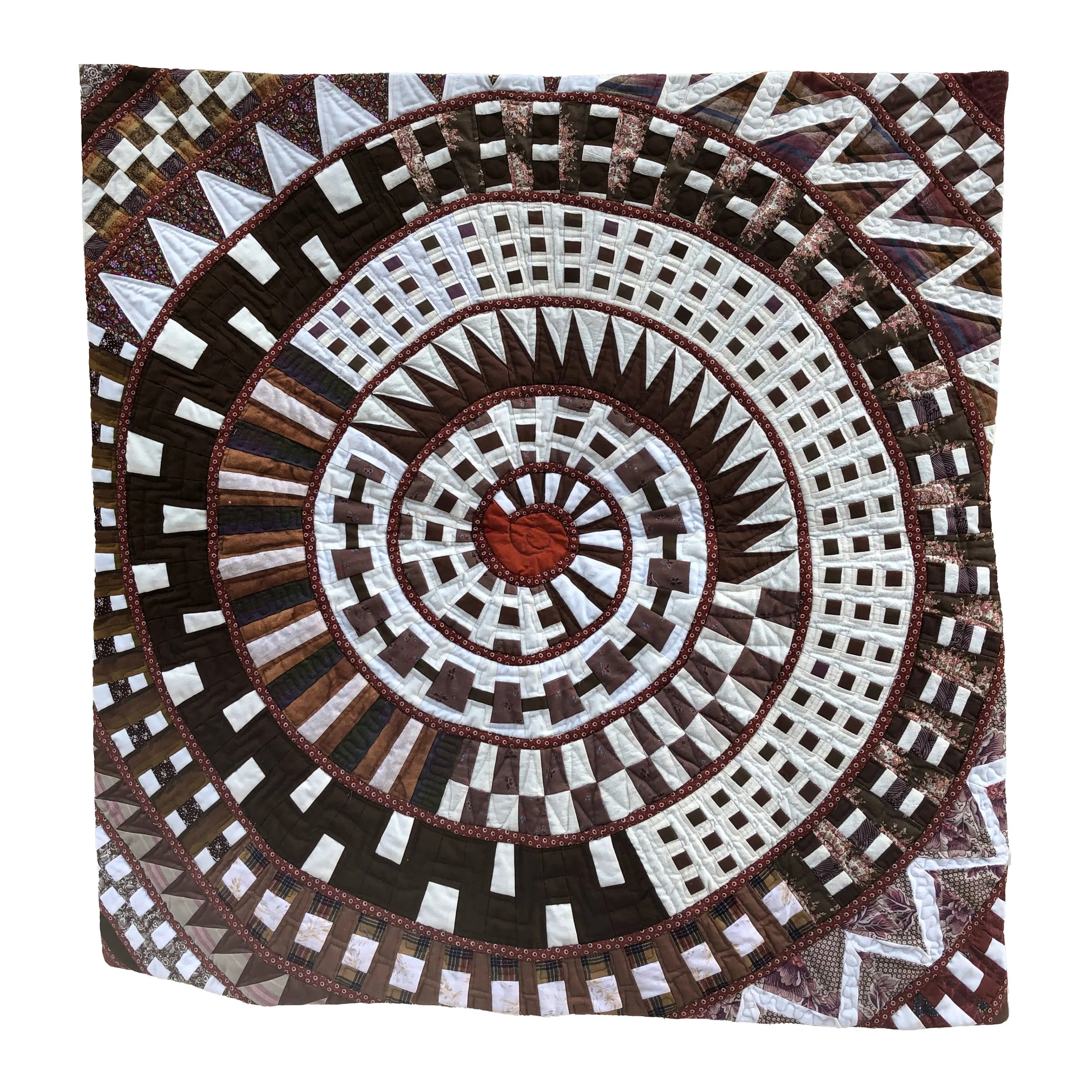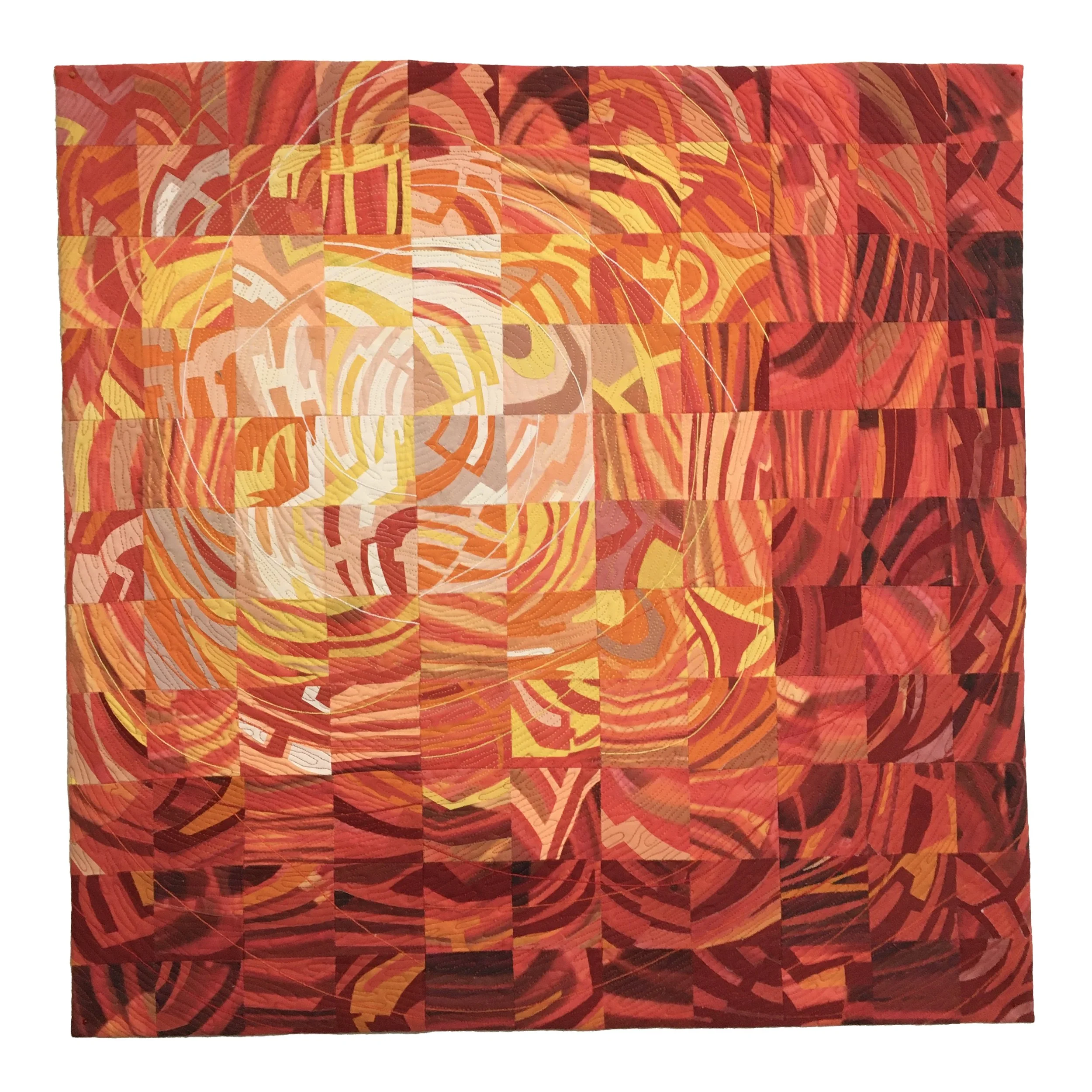 One of a series of spiral quilts. Many of the "rays" are made from pieced strip sets, rather than plain fabric. The patterns and fabrics change as the spiral unfolds. Dimensions: 34" x 34.5"